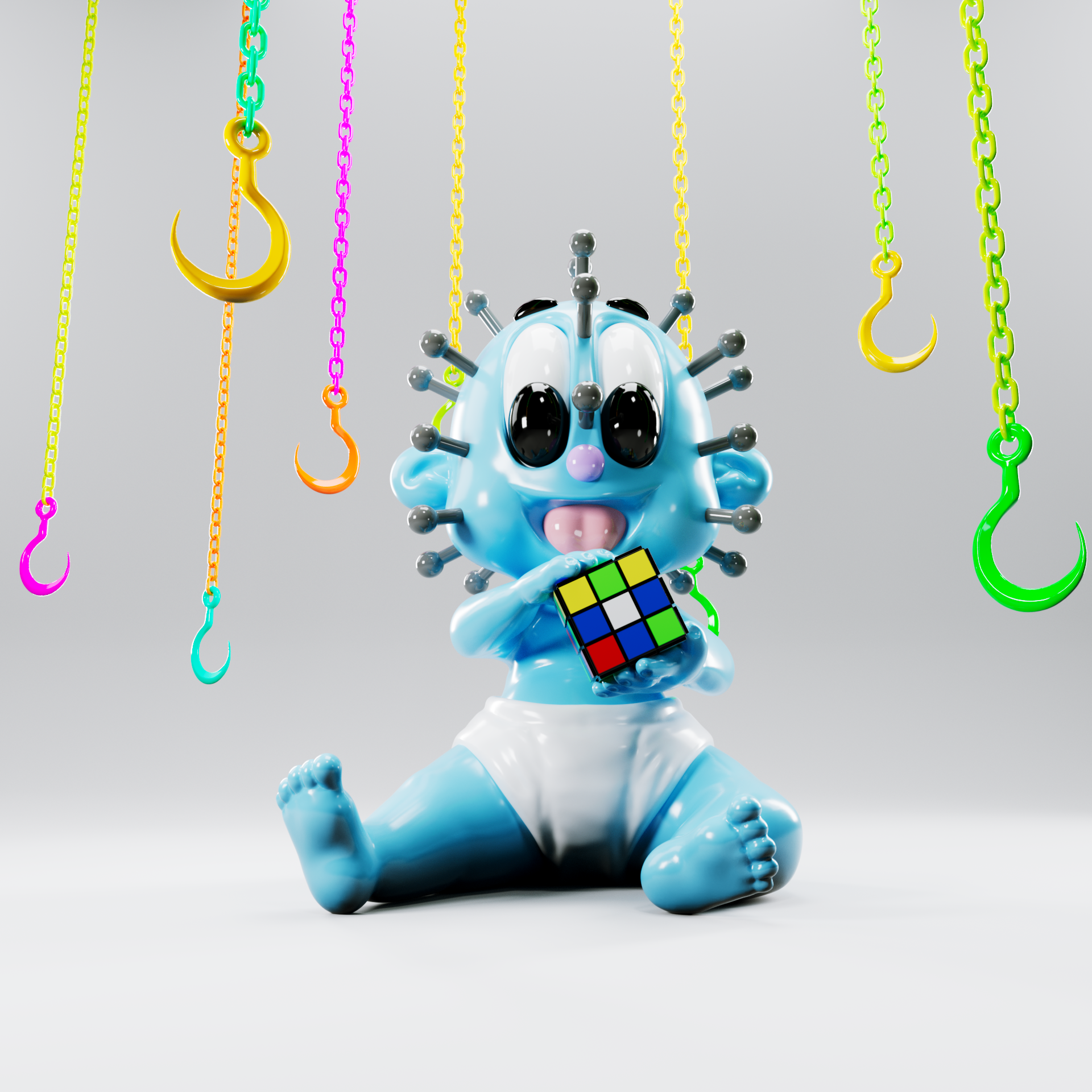 collectible design based on a cult film <<hellraiser>>. Baby cenobite with his iconic cube and meathooks.
